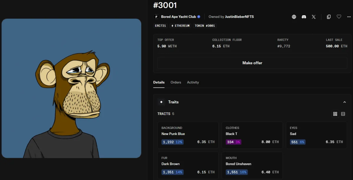 - Current Valuation (Bieber’s #3001): Approximately 5.9 ETH. With ETH at $2,000, this is $11,800 USD.