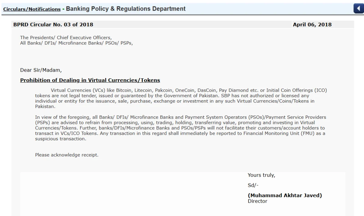 The SBP issued BPRD Circular No. 3, which prohibited all banks, microfinance banks, and payment system operators from processing, using, trading, or investing in virtual currencies. The central bank warned the public that crypto assets were not legal tender and carried significant risks of fraud and volatility.