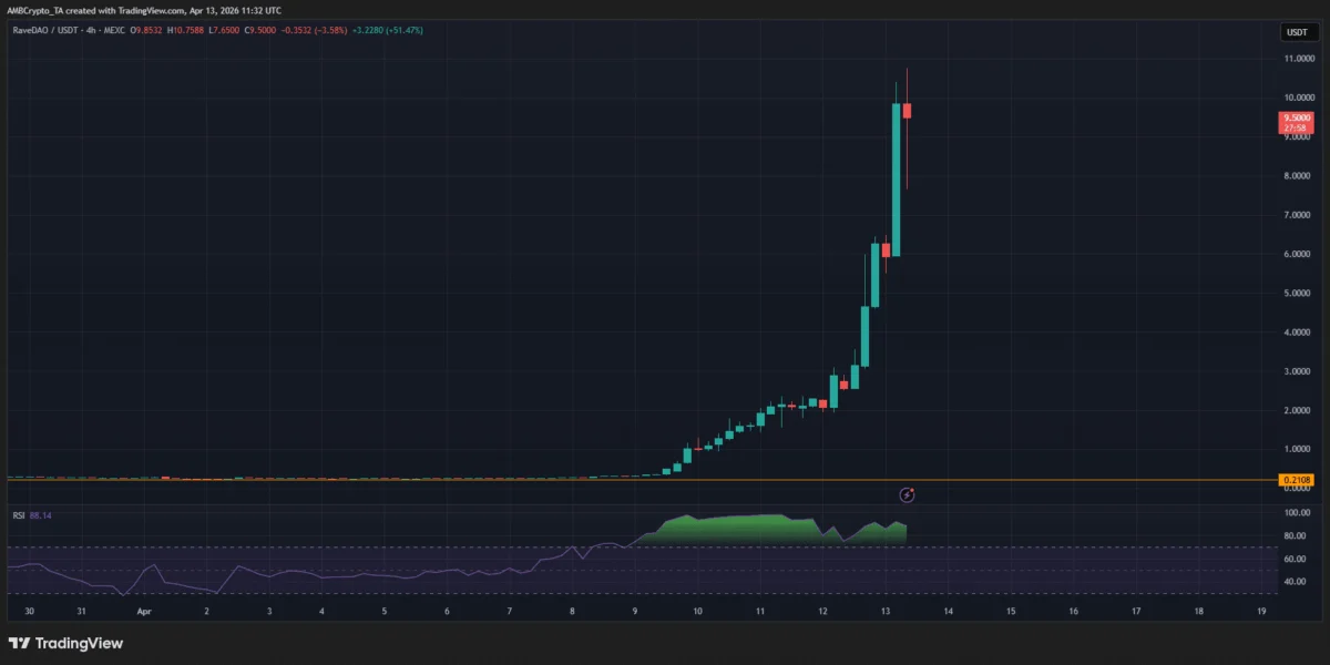 The cryptocurrency market has witnessed a dramatic surge in the price of RaveDAO’s native token, RAVE, as it transitioned from a period of accumulation into an aggressive phase of expansion. This rapid ascent, which saw RAVE move from below the $1 mark to the $9.50 region within a matter of days, signifies a critical shift into price discovery. The accompanying strong bullish candles suggest significant buying pressure and substantial inflows, painting a picture of intense market interest. However, this heightened momentum also brings increased volatility, with early signs of profit-taking emerging at higher price levels. The Relative Strength Index (RSI) nearing 88 underscores the current overbought conditions, indicating a rally that is becoming increasingly crowded and potentially susceptible to a sharp reversal if fresh demand falters.